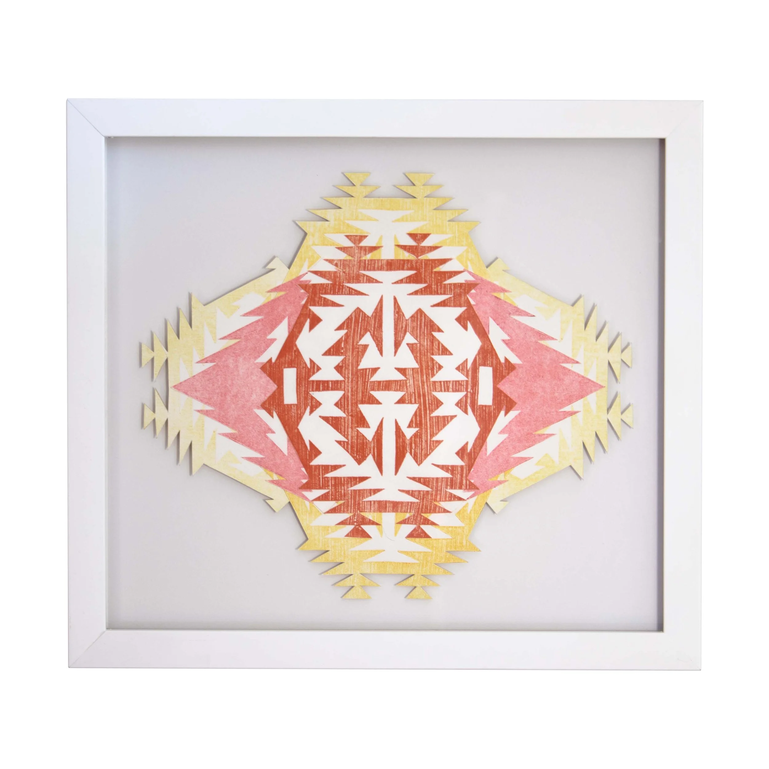 As a digital artist, I create cultural portraits that describe modern day Diné in the visual language of our heritage. I merge the artistry of traditional woven textiles into the format and medium of digital art, and suspend the works in traditional looms. These works emulate the duality of Indigenous traditionalism and the adaptation to western society that shapes much of today’s Diné experience. I use woven patterns in my portraits as a way of both reclaiming and celebrating our visual cultural aesthetic. Prompted by rampant cultural appropriation by corporate industries, I find it an apt response to show who these designs come from and for whom they were made. The works also serve as an homage to weavers and the practice of weaving itself. As a printmaker, I explore what it means to be a part of something and how identity is formed. Coming from a mixed racial background, my identity has often been explained and understood by others in terms of parts, but I don’t experience my identity in parts.
